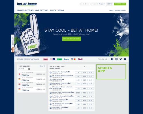 Die Plattform Bet at Home zählt bereits seit einigen Jahren zu den beliebtesten Anbietern im Bereich Glücksspiel und Sportwetten im World Wide Web und betreut tagtäglich mehr als zwei Millionen Kunden und Zocker in ganz Europa. Neben den verschiedensten Sportwetten bietet Bet at Home in diesem Kontext auch Gesellschaftswetten und seit neuestem auch Hundewetten, Games, Poker, Casino Spiele und Slotmaschinen an. Wer also den Gang in das örtliche Casino satt hat und gerne mal das entsprechende Angebot im Internet auschecken möchte, ist bei Bet at Home genau an der richtigen Adresse. Die Nutzeroberfläche ist hierbei relativ einfach und übersichtlich angelegt und erlaubt eine intuitive Navigation. Egal, wo eure Vorlieben im Bereich Sportwetten liegen, auf Bet at Home stehen euch alle Möglichkeiten offen. So könnt ihr hier auf so bekannte Sportarten wie Fussball, Tennis, Handball oder Basketball genauso Wetten abschließen wie auf Cricket, Darts, Rollhockey oder Boxen. Ihr wollt euch einfach mal ausprobieren in der Welt der Sportwetten und womöglich den großen Gewinn absahnen? Dann registriert euch doch einfach kostenlos und schnuppert mal rein bei Bet at Home. Zudem könnt ihr euch auch über Facebook oder Twitter informieren. Dort findet ihr stets die aktuellsten Angebote, Jackpots und Neuerungen bei Bet at Home.